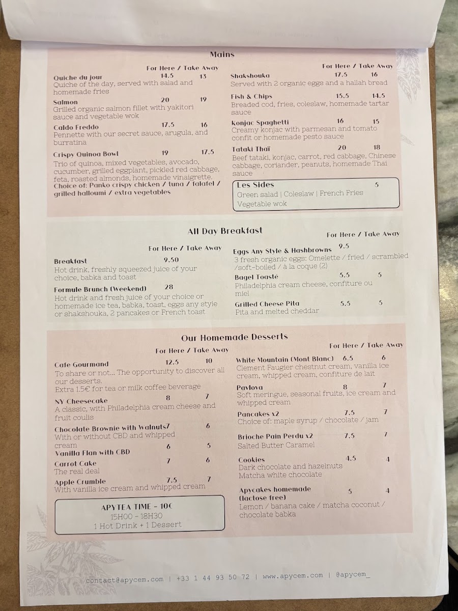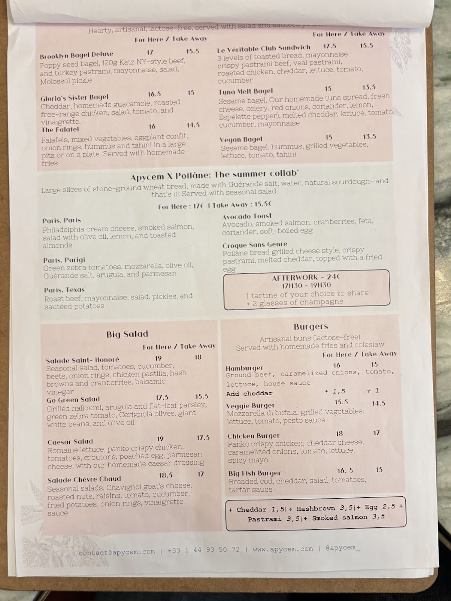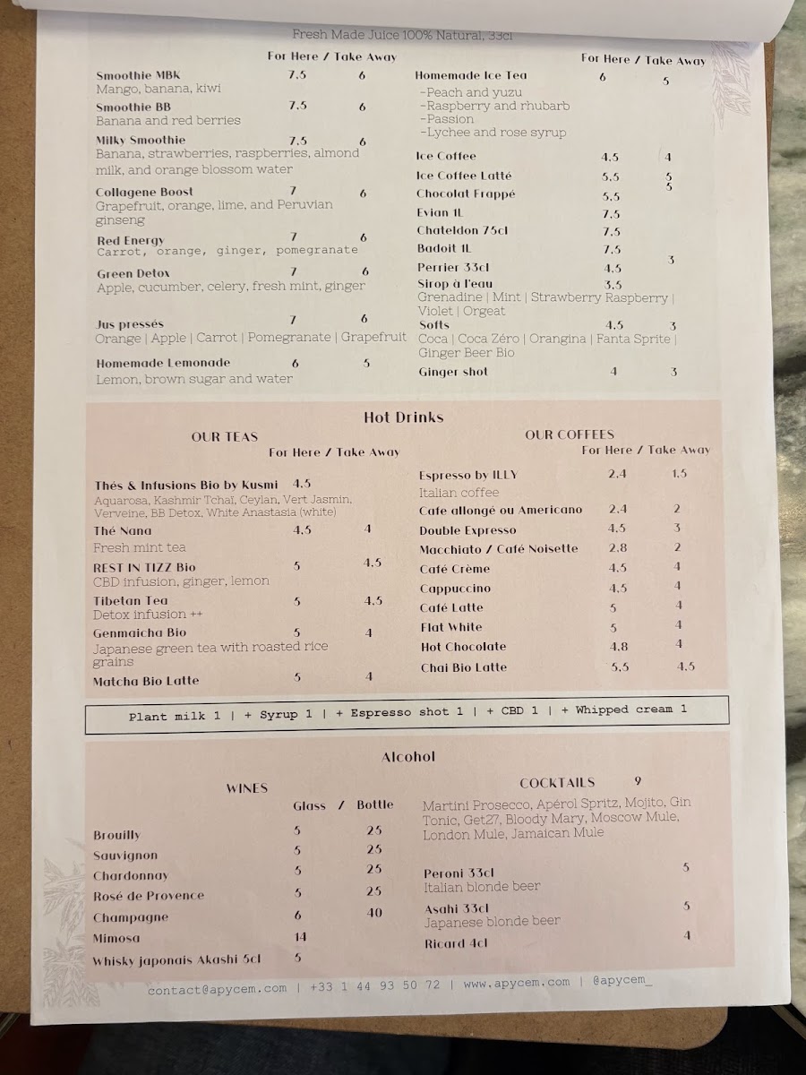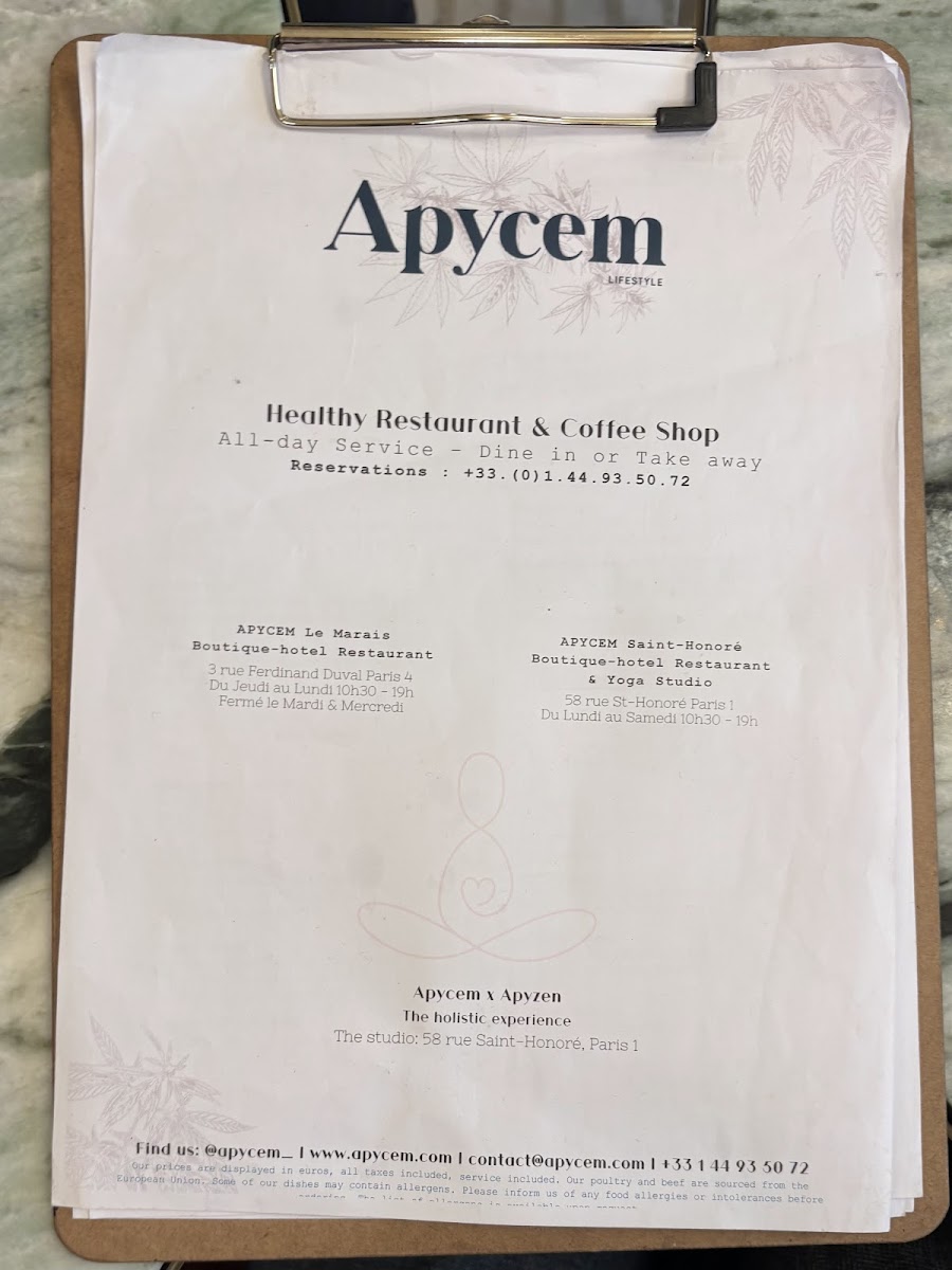 Apycem - Saint-Honoré is a charming café-restaurant nestled in the heart of Paris at 58 Rue Saint-Honoré. Offering a thoughtfully curated menu in both French and English, this spot invites you to indulge in classic Parisian flavors with a fresh twist. The highlight is the inviting breakfast fare: from a fluffy three-egg omelette paired with a crisp homemade thin hash brown to a delicate, freshly made quiche that bursts with flavor. Accompany these with a big pot of tea or freshly squeezed juice for a perfect pairing.